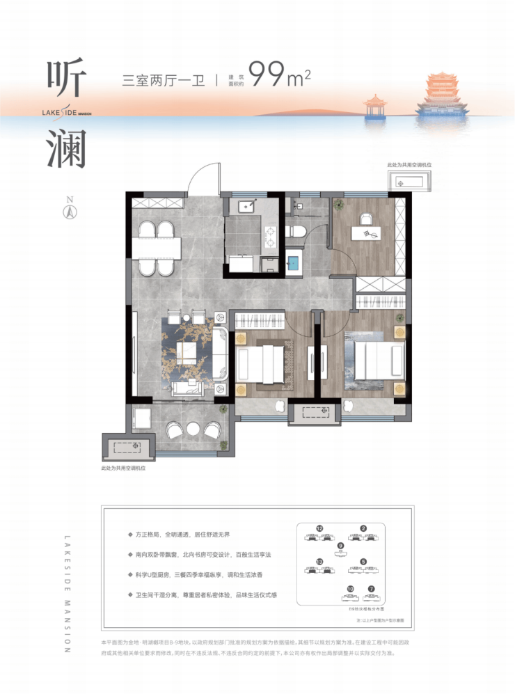 户型面积:三室两厅一卫98㎡、三室两厅两卫111平㎡、127㎡;