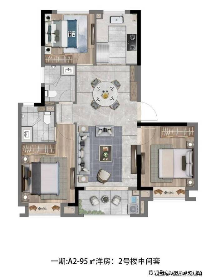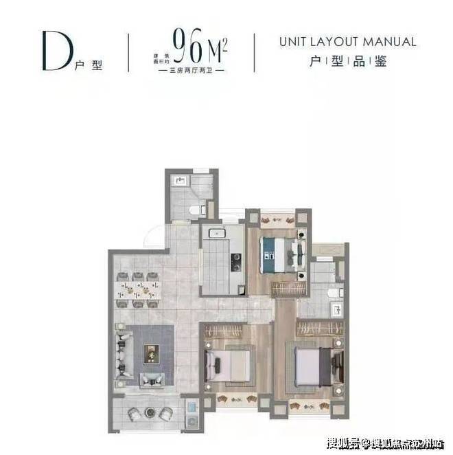 D户型建面约96㎡三房两厅两卫▼