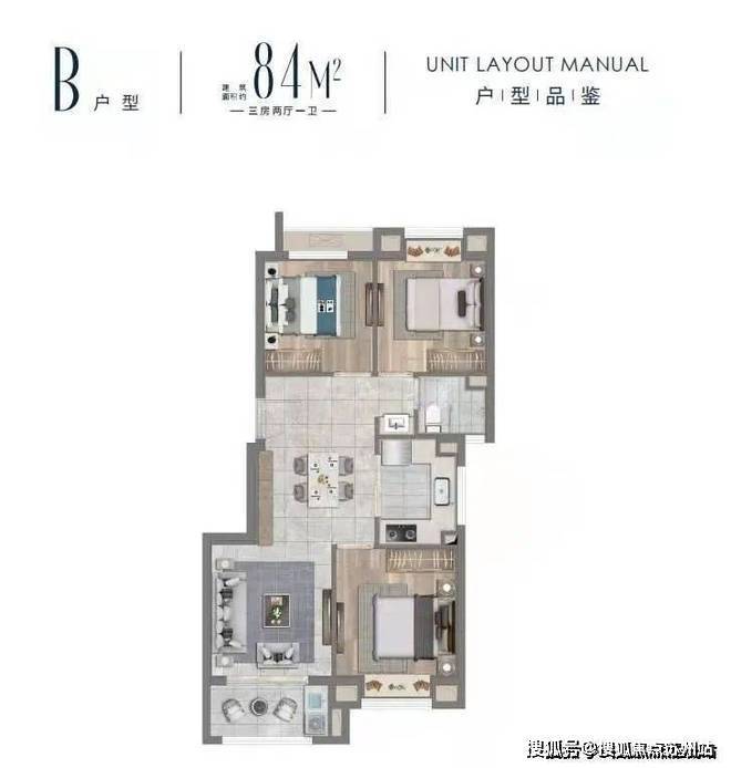 B户型建面约84㎡三房两厅一卫▼