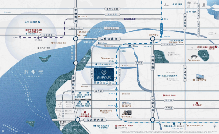 这里占位太湖新城北部的低密生态区,是苏州“一核四城”发展的重要支点。家门口就是东太湖黄金湖岸线,西边离东太湖生态园直线仅约700米,推窗就是湖景公园。