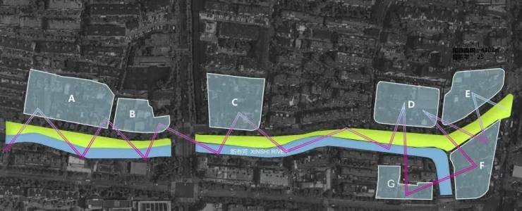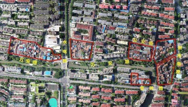 总共7个零散地块,是一个毛地城市更新项目。中间穿插了两条自然河流,一座滨河绿地,多条道路,各自体量都不大,但沿万安路连成一线。