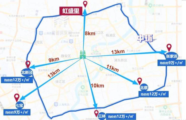 但到人民广场的距离却更远了!例如位于上海南部、浦东三林板块的项目,距人民广场直线距离约10公里,价格却要12万+/㎡,还有位于上海西面的北新泾项目、上海东面的北蔡项目等等。
