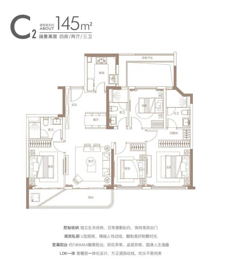 独立玄关、U型厨房、主卧大套间、三开间朝南大面宽等均为标配,堪称140㎡段的“完美四房”。