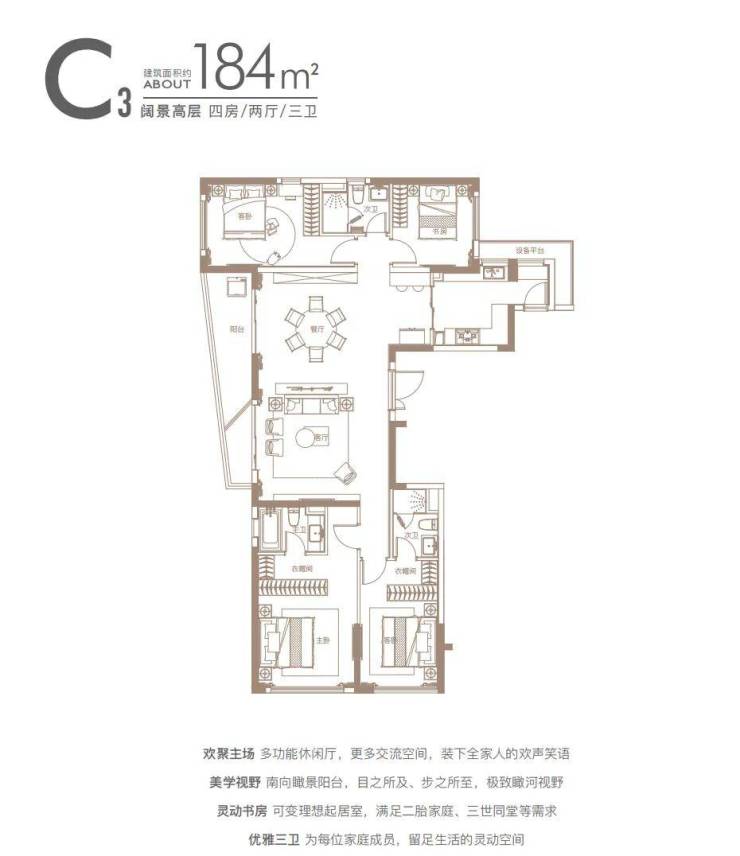餐客厅阳台一线贯通,动线流畅,弧形阳台拓展景观视野。