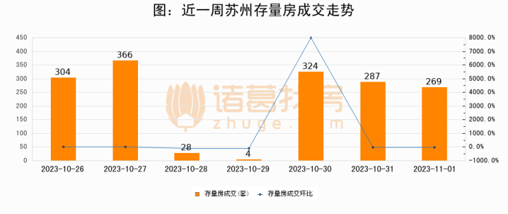 从存量房来看,2023年11月01日苏州存量房单日成交269套,比昨日减少18套,环比下降6.3%。从近一周存量房成交来看,苏州存量房日均成交套数为226套,11月01日单日成交269套,高于近一周平均水平19%。