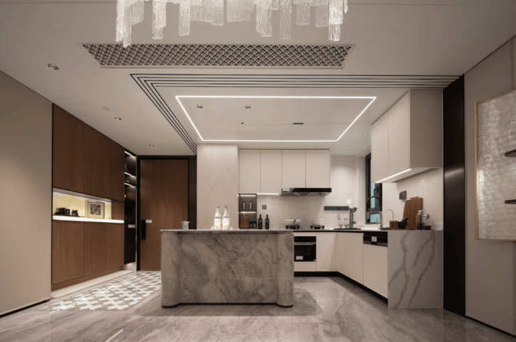 走进海上·清和玺的厨房,墙面岩板通铺,视觉效果超棒.