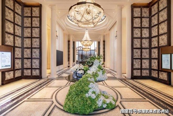预接待厅的「威尼斯白+爵士白石材拼花」地面、E9级进口水晶灯,以手工匠艺致敬奢华质感。