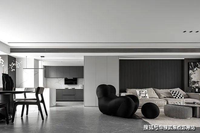 空间布局重新打造,传统设计的隔断被拆除,通透感中,各区域联系更紧密。黑色沙发奇特的造型带来动感和时尚元素,沙发上有凸起设计,提高支撑感,让居者小憩时更加舒适,体会时光温柔。