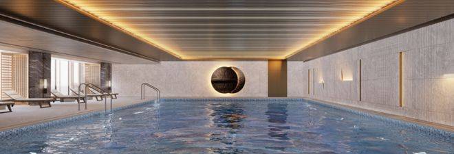 它不是其他项目简单的沿底商横排布局,而是纯原生“住宅化”打造,进门之后就是极具“安曼酒店风”的景墙、植被和镜面水系。