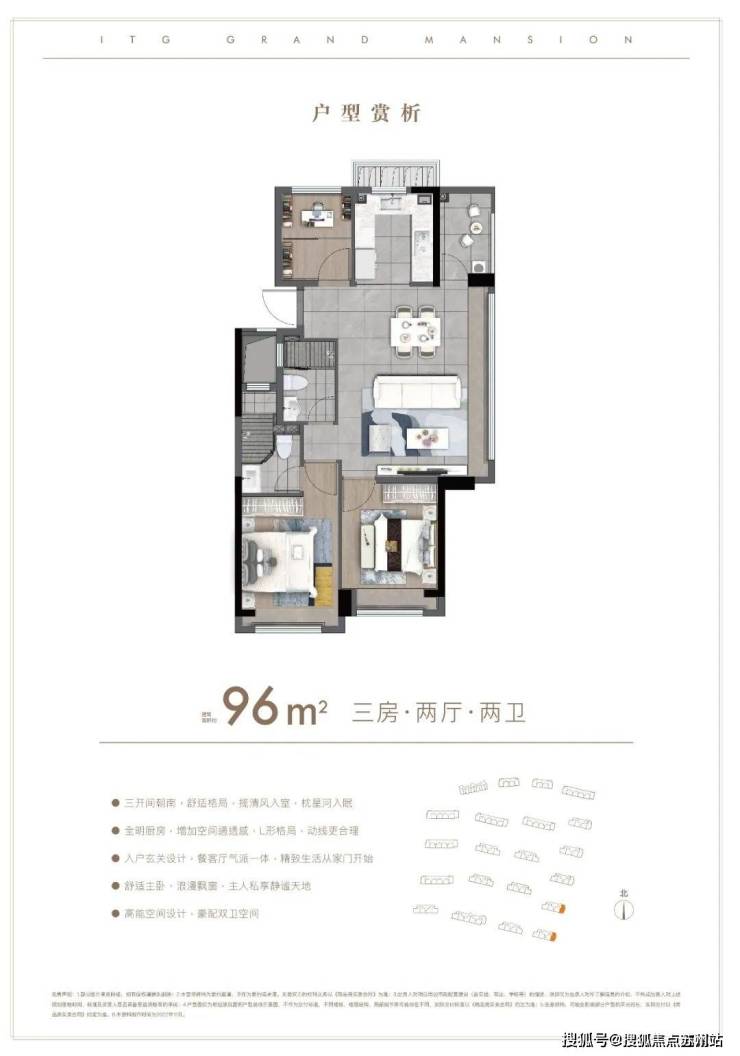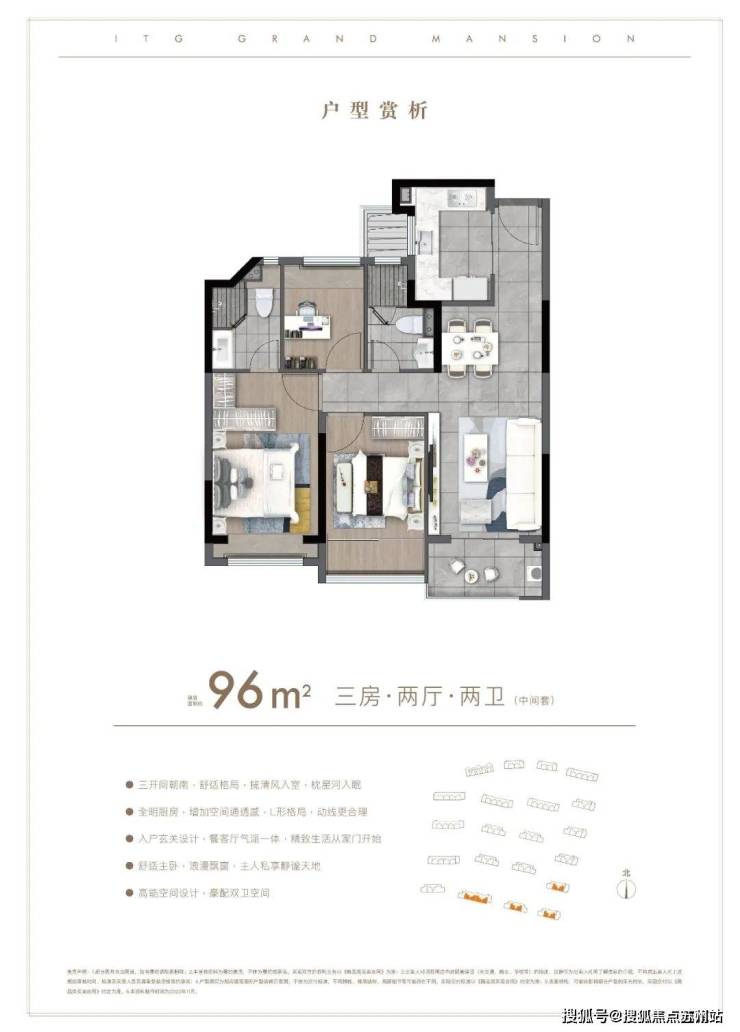 户型方面:约85-96㎡的全三房设计,每一款户型都是会传递出国贸的产品观。南北通透,布局考究,动静分离。