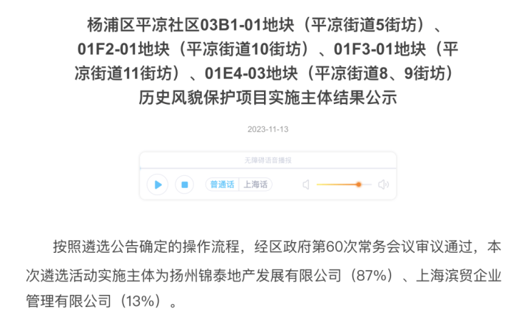 2023年12月,中信泰富(87%)联合杨浦国资(13%)通过协议出让,以总价1143905万元,楼面价63127元/m²竞得4宗打包地块: