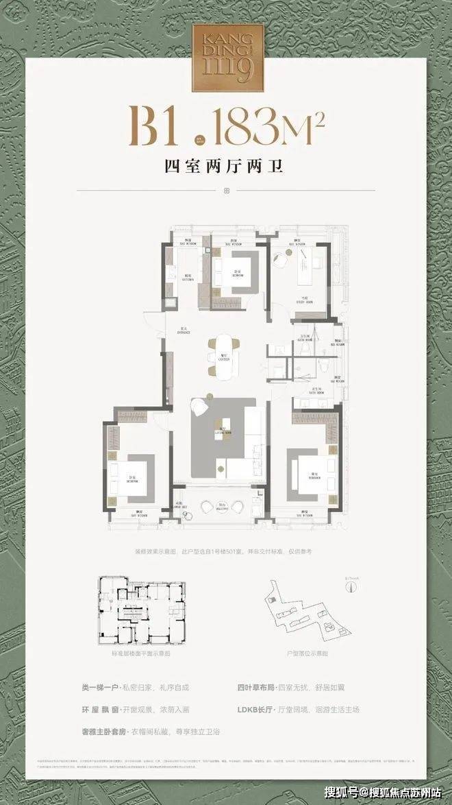 康定壹拾玖售楼中心:400-8787-554建筑面积约1 83㎡户型,类一梯一户设计,电梯厅私密入户,无需路过/被路过同层邻居家门,尊享悦己的静谧;四个房间,适配全家庭结构,从小太阳到三代亲都能轻松托举;标配飘窗,厨房双卫皆明媚,每一处都有阳光与自然的盛情款待;LDKB长厅,打开轩阔的生活舞台,亲友聚会,圈层社交尽显风范;步入式衣帽间,独立卫浴的套房主卧,是给予生活鉴赏家最佳的犒赏。