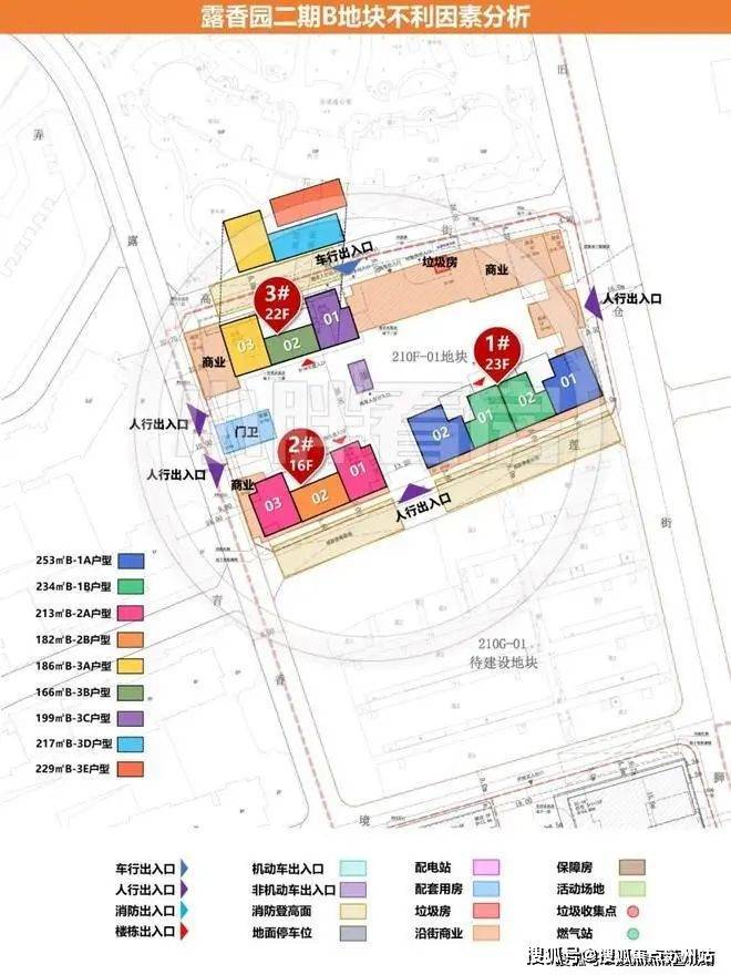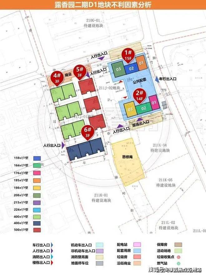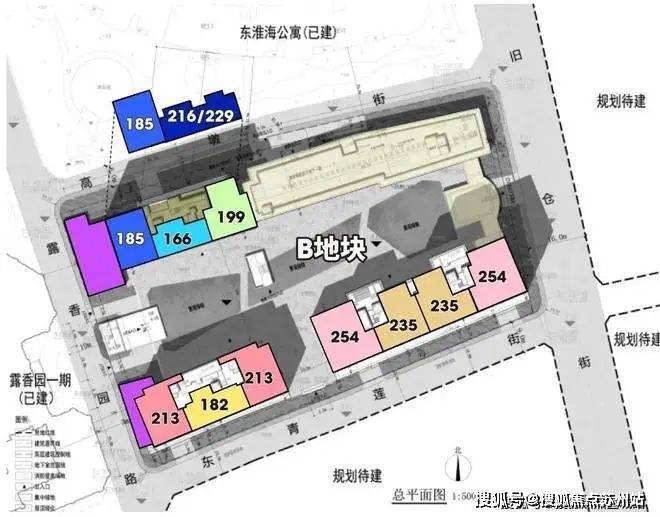 其中右上角的A地块是高层住宅,大概150套住宅,北栋为建面约263-370-487㎡;南栋为建面约279-290-375-494㎡。