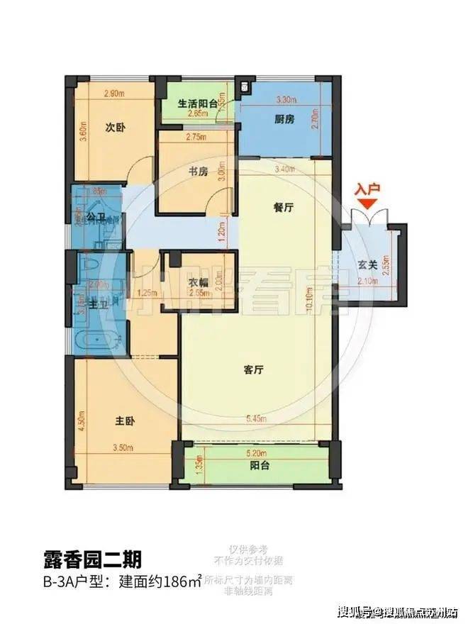 露香园二期售楼处电话☎400-8123-664✔✔✔该户型为飞机户型,公区集中在中部,独立玄关入户,仪式感较强。横厅配置,两面宽超大阳台,增添社交休闲属性。三间卧室朝南,分别居于客餐厅左右两侧,其中主卧配置相对豪华,拥有较大衣帽间以及四件套酒店式卫生间,另外两间次卧尺寸合理也相对安静。整体配置舒适宽敞,虽然不是南北通透,但南侧采光面较大,适合全龄段生活场景所需。