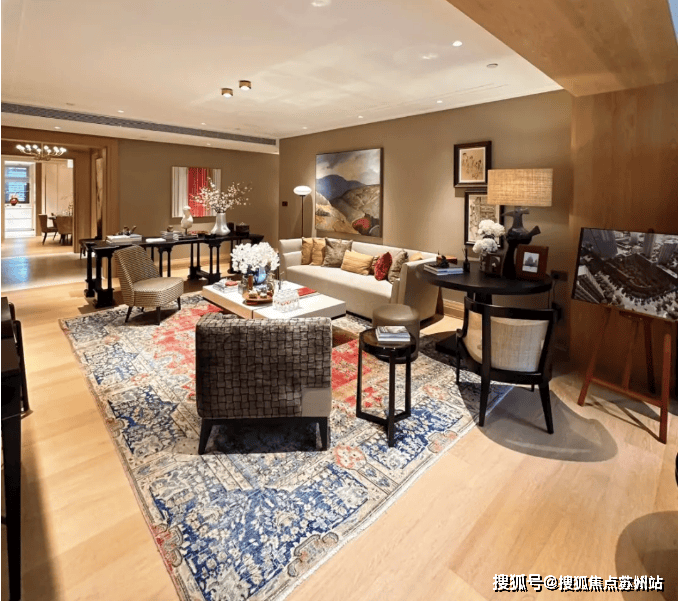 正式的大沙发区域,灵活散座区域,家具注重收藏种类多样性,中式圈椅,西式小沙发,灵活移动,根据需求可聚可散。手工编织的复古羊毛波斯地毯,用植物和矿物天然染料来进行染色,拥有了抗衡时间侵蚀的美,更增加了收藏的丰富性,是高品味的体现。