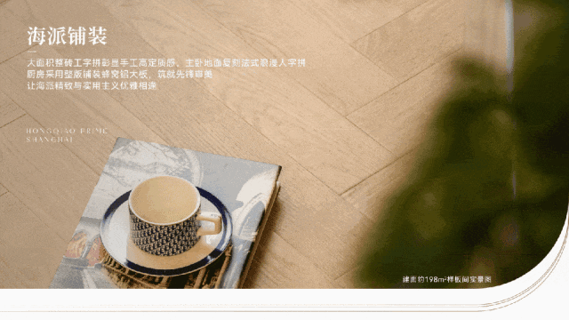 全手工拼接的大面积整砖工字拼售楼处电话:400-8787-554、主卧复刻法式浪漫人字拼的海派铺装工艺;建筑立面和室内吊顶的海派弧形元素;以及随处可见的海派拼花,皆是海派精致与实用主义的优雅相逢。