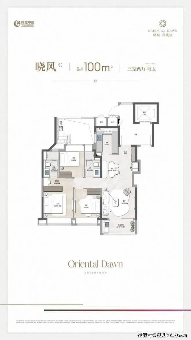 绿城·春晓园预约热线:400-8673-567【营销中心电话】C户型:4-1幢3号02室,4-2幢27号02室中间套厨房为U型玄关面积缩短客厅面宽约3.65米尺度感更大「晓风D丨 100㎡ 3房2厅2卫」同B户型