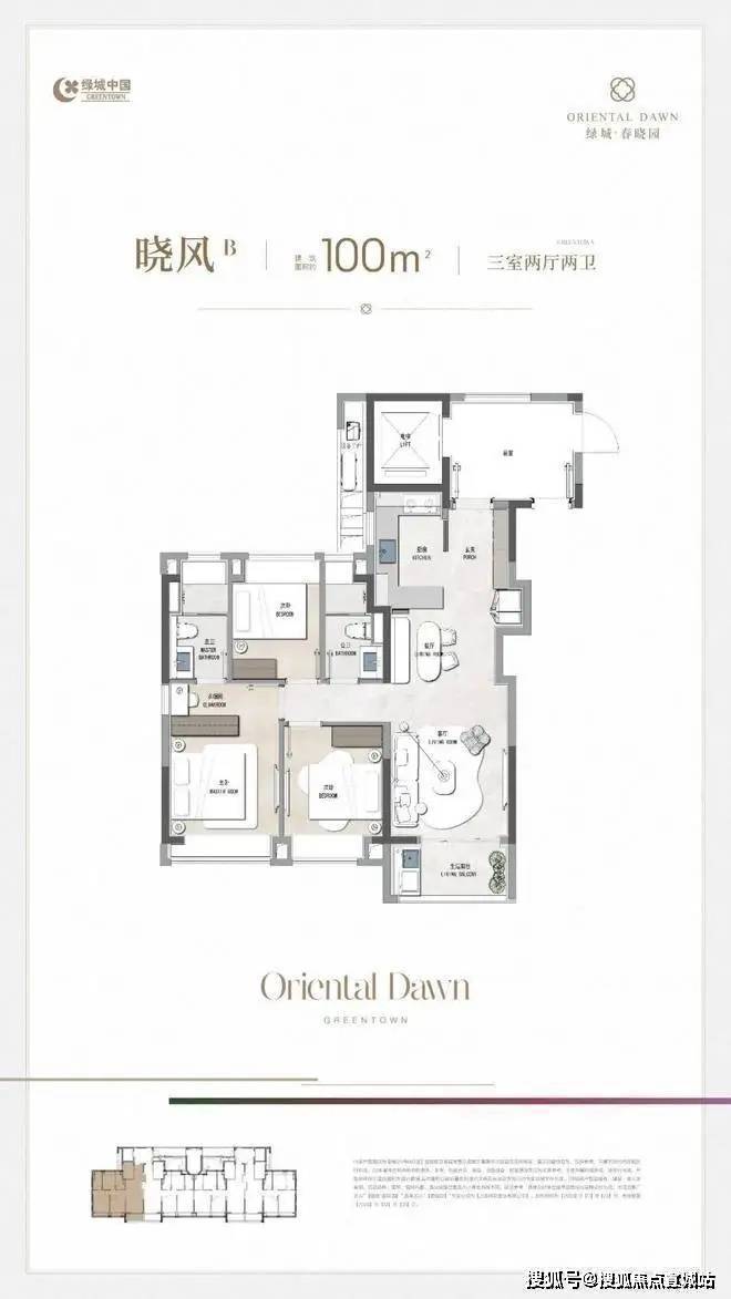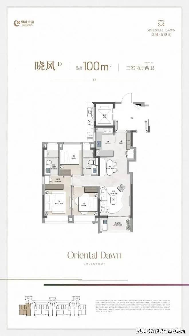 绿城·春晓园预约热线:400-8673-567【营销中心电话】A户型:1幢 9号10号2幢 7号8号第一排南向水景,采光视野均无遮挡,阳台为全封闭交付,开放式厨房&中岛台,客厅面宽约3.4米客厅进深短80cm左右「晓风B丨 100㎡ 3房2厅2卫」开放式厨房