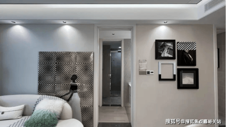 客厅和主卧都标配悬浮吊顶、无主灯设计,背景墙采用皮革和铝合金拼接,也都是实体交付的.