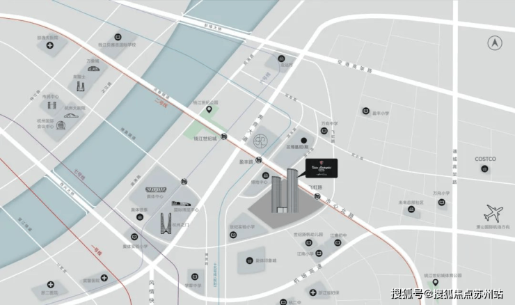钱江世纪城奔竞大道的战略地位,堪比纽约第五大道与巴黎香榭丽舍的叠加态。项目与SKP直线500米的黄金距离,构建起"步行5分钟即达亚洲店王"的消费霸权,而亚运"莲花碗"与杭州之门形成的270°江景视野,则复刻了香港维多利亚港的景观溢价模型。地铁2号线上盖的交通优势,使得15分钟直达萧山机场的效率,足以对标伦敦金丝雀码头的商务能级。