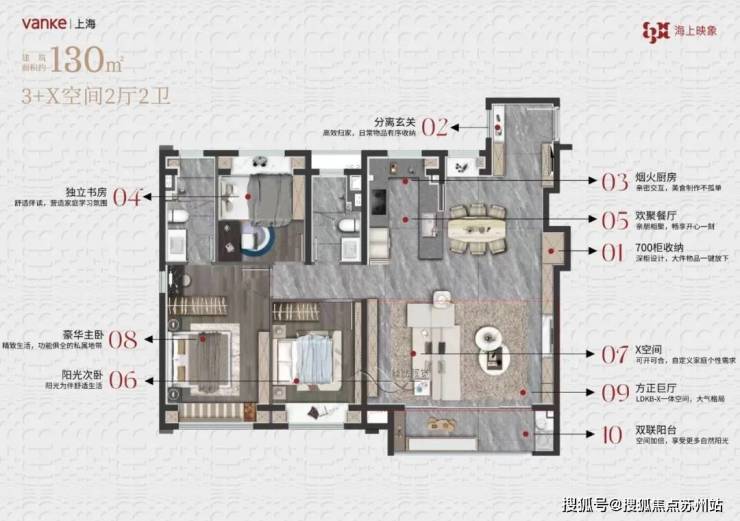 在海上映象,回家是一场充满温度与仪式感的追光之旅。指引方向的城市灯塔,浪漫光影的架空公区,造型优美而层次分明的地上大堂,明亮清晰的行车空间与渐变引导的地库坡道,照亮每一步归家的路途。海上映象规划15幢13-18层公寓,60%为约130㎡以上大户型,令社区品质更上一层楼,也成为松江新城弥足珍贵的改善型社区首选。建筑面积从约100m²、130m²、150m²不等,On the sea, going home is a journey of chasing the light full of temperature and ritual. The city lighthouse that guides the direction, the romantic overhead public area, the beautifully shaped and well-defined lobby on the ground, the bright and clear driving space and the gradual guidance of the basement ramp illuminate every step of the way home. There are 15 13-18-storey apartments planned in Haiyang Image, 60% of which are large-sized apartments with a size of about 130m2 or more, which makes the community quality by going up one flight of stairs and become the precious first choice for improved communities in Songjiang New Town. The building area ranges from about 100m², 130m² and 150m².
