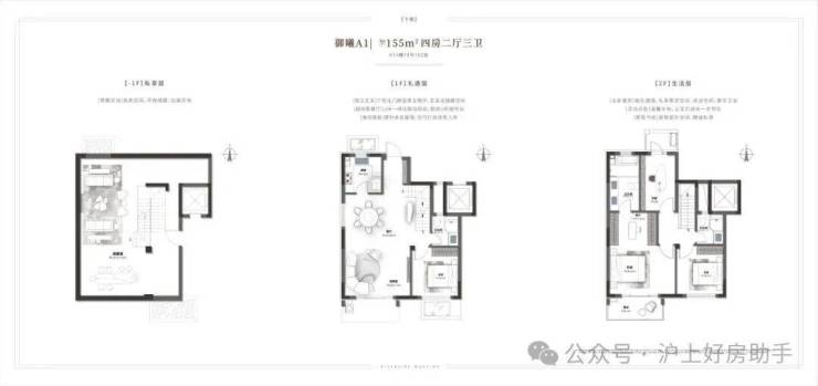 上叠:三层长辈房+奢阔一体化客餐厅,U型厨房空间;四层三房两卫布局,尊享主卧套房;北侧星空露台及顶层,美好生活自由定义。
