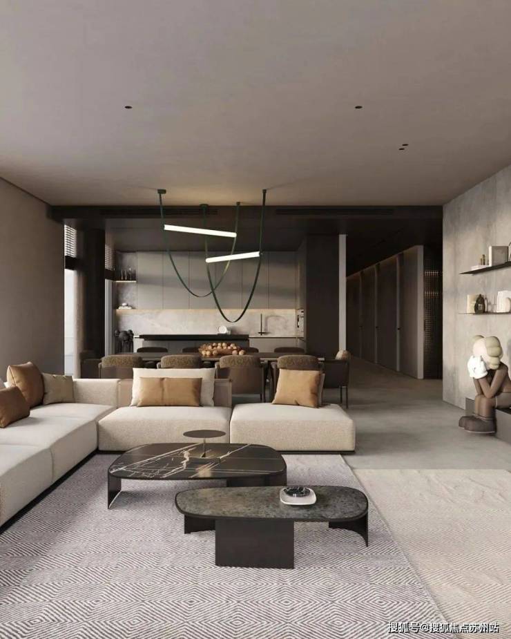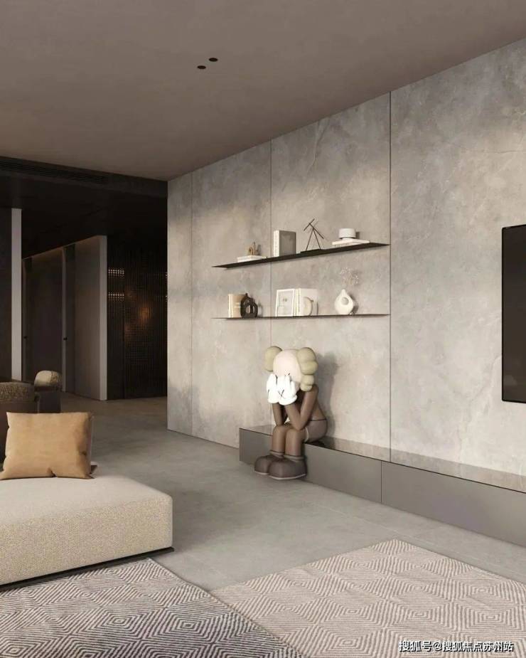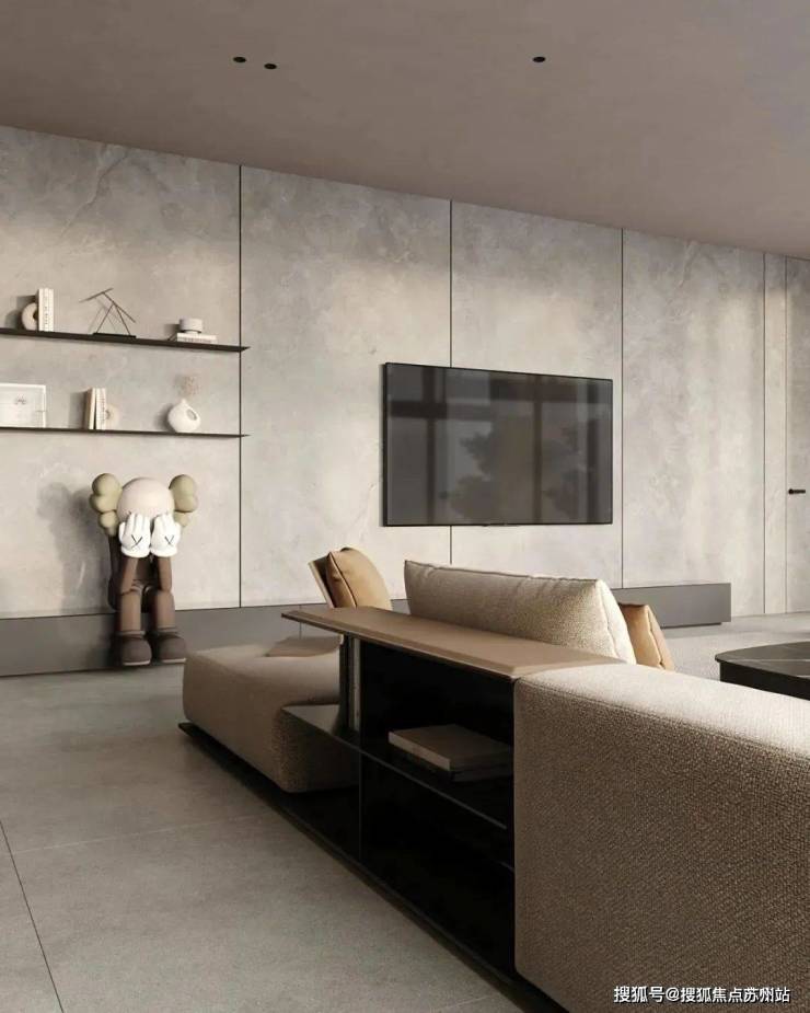 客厅中,蓝城丹枫云庐售楼处电话☎:400-882-8814(预约热线)✔✔✔设计师选用暖灰色作为空间的主色调,奠定整体沉稳的空间基调。灰白色的布艺沙发搭配上造型简洁的黑色大理石茶几,形成了色彩上的对比。大理石上细腻的纹理丰富了空间的细节,提升了整体的质感。大面的落地窗保证了室内拥有充足的光线,给人明亮的视觉感受。电视墙的设计十分简洁耐看。