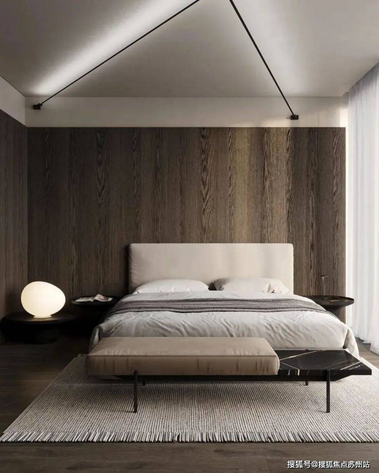 蓝城丹枫云庐售楼处电话☎:400-882-8814(预约热线)✔✔✔主卧的色调十分简约内敛,为屋主打造出了一个能够使人沉淀心灵的休憩空间。深木色的存在让空间更显厚重而沉稳,柔软而蓬松的白色床品与其形成了对比。床头灯的造型简洁却富有设计感,床对面的沙发椅能够让屋主在这里度过惬意的下午茶时光。衣帽间中则选用深色与暖调的灯光营造精致的空间氛围。