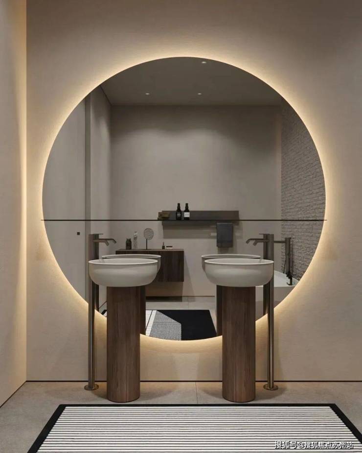 蓝城丹枫云庐售楼处电话☎:400-882-8814(预约热线)✔✔✔卫生间中,设计师选用灰白色作为空间的主色调,营造出一种舒适的轻盈感。圆形的镜面,让空间更显柔和与开阔。镜面背后的暖色灯光增添了空间的温馨质感。