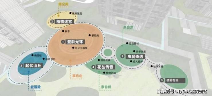 “混龄光环”组团其实更像是社区内的游乐天地,这里分布着众多的活动场域,如:植物迷宫、植物花园、起伏山丘、花丛传音、虫洞奇遇等等。