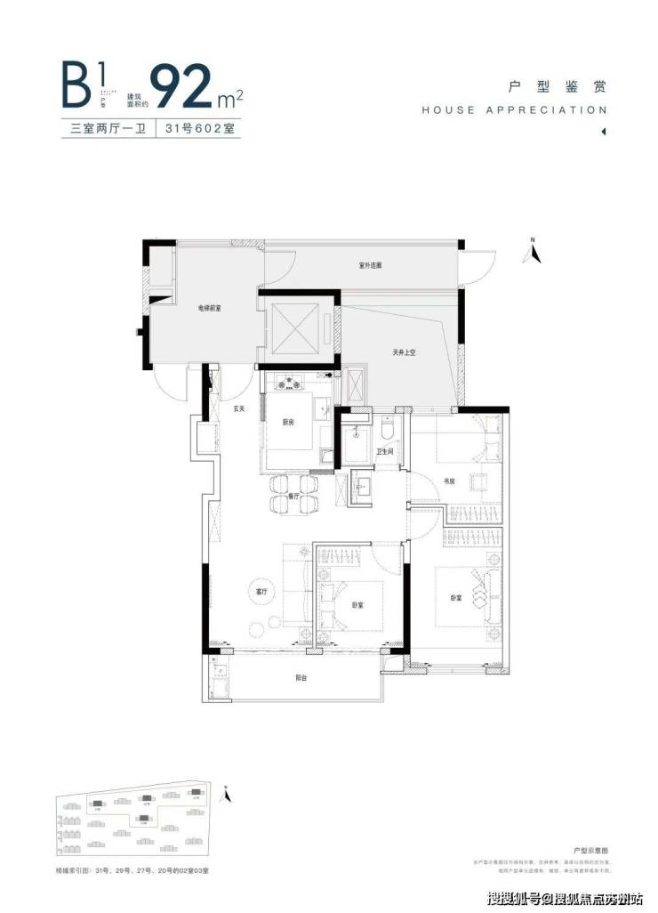 92m²户型,3开间朝南,双阳台设计,阳台的南向面宽接近6米,更具视觉延展性;