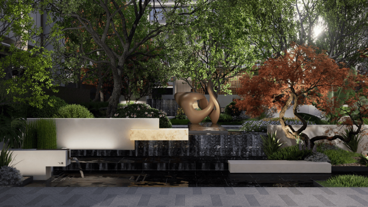 小区大门就花了重金打造,约52米宽的超气派门头,用了很多高档石材和金属,看起来就像千万豪宅的排面。归家路上有艺术雕塑、酒店式大堂,中心还有精心设计的花园水景,八大巷道种满了名贵树木,每次回家都是一种享受,充满了归家仪式感。