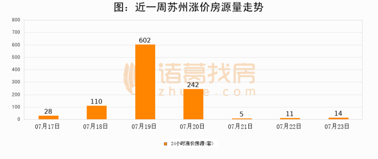 根据诸葛找房数据显示,苏州24小时涨价房源量为14套,较07月22日增加3套,环比上涨27.3%。与此同时,涨价房源占比小幅扩大,业主信心有所提升。