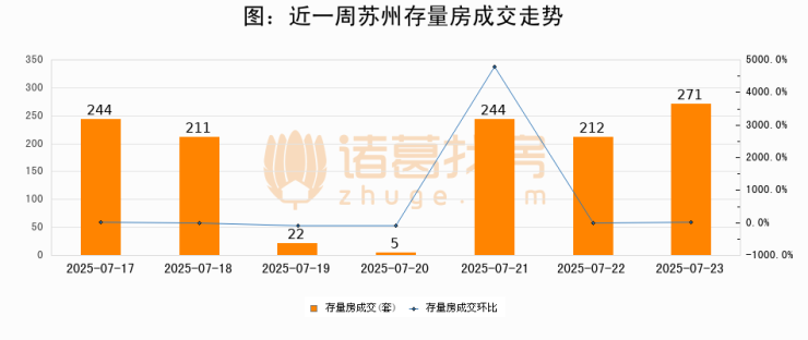 从存量房来看,2025年07月23日苏州存量房单日成交271套,比昨日增加59套,环比上涨27.8%。从近一周存量房成交来看,苏州存量房日均成交套数为172套,07月23日单日成交271套,高于近一周平均水平57.6%。