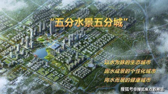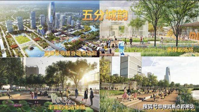 五分城韵:蓝绿景观结合城市功能,塑造多样的场所、丰富的生活体验,景观与建筑相互渗透,水与城有机融为一体,实现“虹桥主城、尚水前湾”的发展愿景。