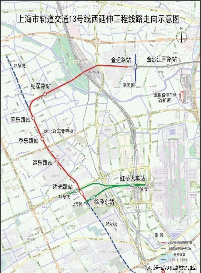 13号线西延伸工程自金运路站(不含)至诸光路站,全长9.47公里,将为虹桥商务区与市中心及浦东的联系开辟新的快捷路线。这条线路大致沿金沙江西路—纪宏路—联友路—金丰路—诸光路走行,可与2号线、17号线换乘。