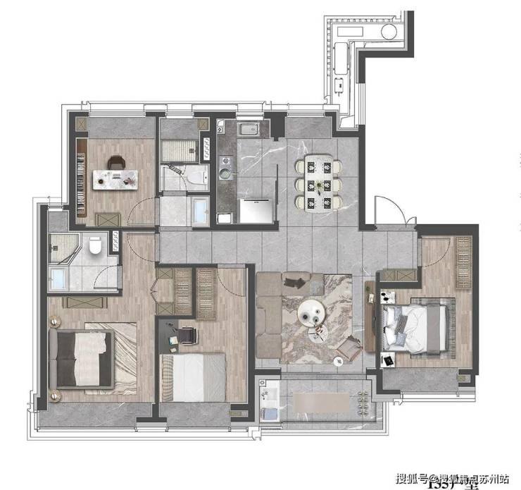 该户型贴合当代人居生活习惯,既适合三口之家小太阳家庭,也可以是三代同堂,每个人都能拥有独立空间。