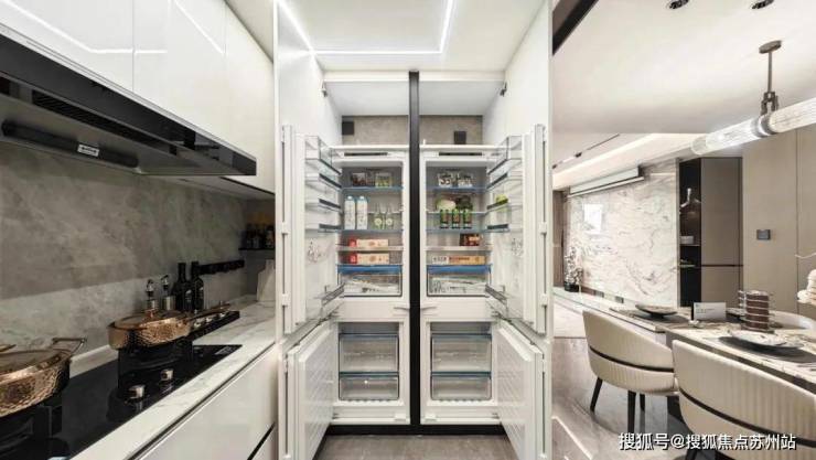 厨房空间,甄选西门子新款的抽油烟机、灶具、洗碗机等,甚至连大部分项目不配备的冰箱也是交付标准;还特别配置了轨道插座、前端净水器和凉霸;吊轨金属玻璃移门,既美观又方便清理。