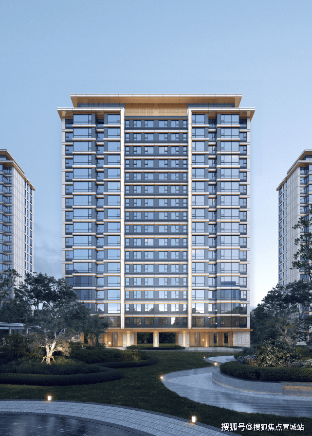 外立面设计上,立面利用大面积玻璃+阳台落地窗+金属型材+层间装饰提升建筑整体感和精致度,顶层外挑飘板使得建筑立面体块清晰,层次丰富。