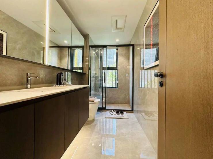装标上,项目有毛坯和精装两种选择。日立的中央空调、威能地暖/热水器、格兰斯柯的新风、高仪的淋雨滑竿、手持花洒、单把手台盆龙头,还有更多细节之处,比如鞋柜精灵、主卫镜柜美妆冰箱等都安排上了。