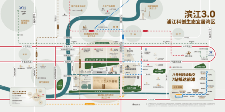 项目距离8号线延长线汇臻路站直线约1.4公里,同时近享BRT快速公交,7站抵达前滩东方体育中心,全线与14条轨交线换乘,通达全上海。