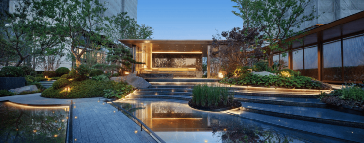 三重归家仪式。第一重,泛星大堂。第二重,聆星客厅。第三重,伴星入户花园。社区核心景观——星光溪涧。灵感取自于西湖边的九溪十八涧,把江南的山、江南的石、江南的小桥和流水都搬进星曜社区。