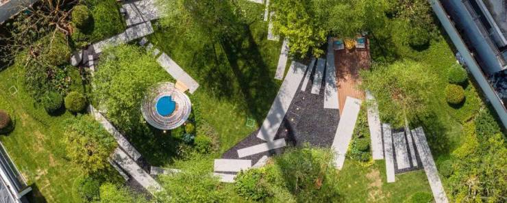 中岛水景,池底采用蓝钻花岗岩和阿尔卑斯灰仿石砖拼花定制星语言铺地,包括两边景墙立面选用高端的爱马仕灰奢石,彰显出顶级石材的大气典雅。包括景墙转角的弧面,工艺难度非常大。