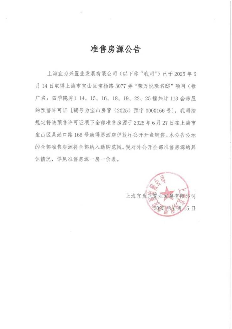 本项目推广名:四季隐秀,备案名:荣万悦璟名邸,开发商:上海宜为兴置业发展有限公司,项目销售代理公司:上海唯家房地产咨询有限公司,上海尊毓房地产经纪有限公司,广告代理公司:上海和视品牌管理有限公司,本资料为宣传资料,仅作为要约邀请,不作为销售承诺。项目不排除因政府相关规划、规定及开发商未能控制的原因而发生变化,最终以双方签署的正式《商品房买卖合同》及其他相关协议文本为准。预售证号:宝山房管(2025)预字0000166号。资料发布时间:2025年6月。