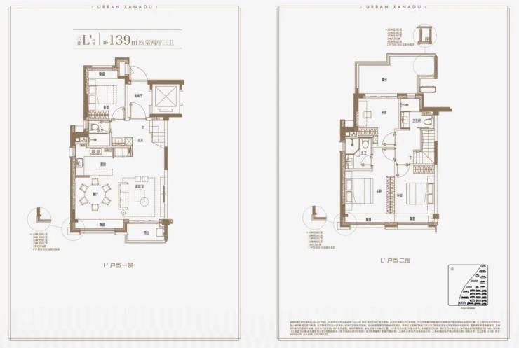 建面约139㎡上叠户型,三层是会客区,四层是居住区,阳台+露台+多个飘窗设计,附加空间非常大,在别墅类产品中实属罕见!