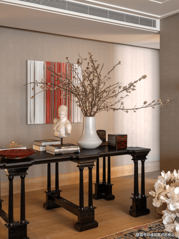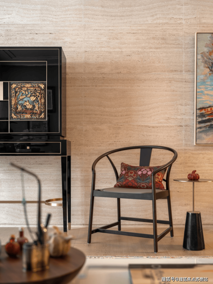 上海虹口天潼里售楼处电话☎:400-8123-664(预约看房热线)融合焕新的高柜摆放于洞石墙前,哑光与纹路丰富的米白洞石衬托出了高光黑色烤漆的深邃与沉静。而嵌入柜面的中式楠木挂屏无疑是点睛之笔,采用朱红鎏金工艺对人物和图案进行着色,展现了传统与现代完美融合的可能性。