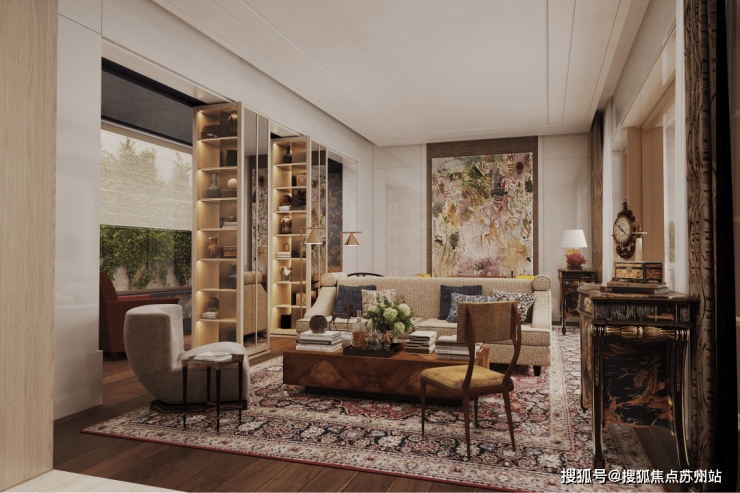 上海虹口天潼里售楼处电话☎:400-8123-664(预约看房热线)客厅另一端,是连接房内与外景的介质空间,在这里主人和客人可以享受美酒雪茄。看似独立的空间,实际延伸了客厅的功能,也延伸了窗外景观到室内的视线。