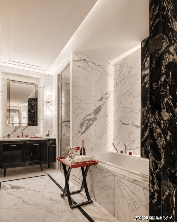 秩序,是主卫浴空间布局的重点。两个独立台盆相对而立,分属男女主人,营造出从容自如的使用体验。大面积运用黑白撞色大理石,让空间的秩序美与材质的自然美融合,颇具观赏韵味。