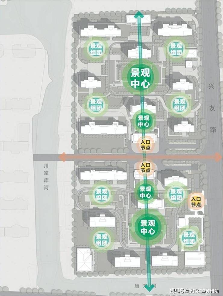 以一轴双园八组团,将内部中心花园与组团景观相结合,双景观轴线贯穿小区、串联楼栋,形成落客庭院、水榭林间、微风草坪等场景,让业主下楼即可在社区私享园林自由徘徊,出社区即可享受家门口的生态公园。