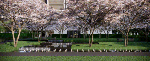 ➤ 落客庭院,进入迎宾门廊便是落客庭院,定制的整石雕刻而成的石台上镶嵌着金色的项目logo,特选的从生乌桕赫然挺立,在静静等候业主的到来;